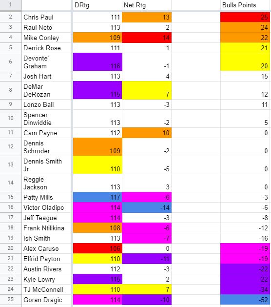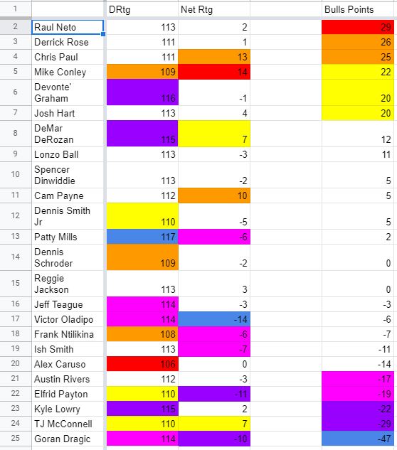 Then I remembered that the Bulls needed players that would get to the foul line, not turn the ball over, and not commit fouls. How could I demonstrate the importance of those characteristics? Easily enough. I added 20 points for the best Free Throw Attempts, Turnovers, Turnover %, and Personal Foul stats. 10 for the second and third best stats in those categories, and 5 points for the fourth and fifth best stats. On the opposite side, I awarded -20, -10, and -5 points for the worst stats in those categories. It was a brilliant strategy, and the perfect way to find the Bulls free agent point guard.