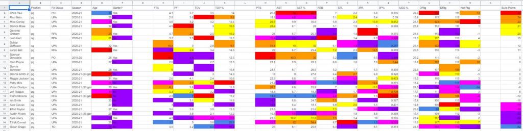 With my pool of free agents settled, I needed to put all their important stats up on the spreadsheet, and to do that I had to ask myself, what makes a point guard great? A great point guard drives the lane and sets up his teammates, naturally I added a bunch of assist stats to the spreadsheet. A great point guard spreads the floor with their shooting, I included some 3 point stats. In the case of the Bulls, a great point guard needs to be a decent defender as a compliment to Zach LaVine, that means stats like steals and blocks and defensive rating should be included on the spreadsheet. But point guards don’t really get a lot of blocks, so maybe not blocks. And if I was including defensive rating, I may as well add offensive rating, and net rating to the sheet.