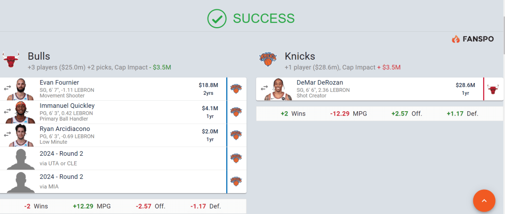 Any trade with the Knicks is going to include Vucevic’s best buddy from their Orlando days, Evan Fournier. Hopefully the two of them still get along. Immanuel Quickley has been a bit disgruntled with his role so he might be gettable. Also, how could you not bring back Ryan Arcidiacono. No ‘diacono, no deal.