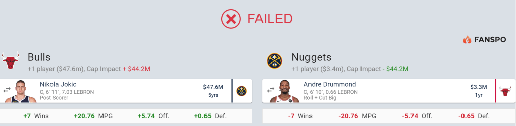 It’s frustrating that this deal failed. The two players are obviously comparable in ability, but the draconian NBA salary cap rules appear to hinder this otherwise fair and equitable deal. Too bad. I feel sorry for all the Nuggets fans who are going to miss out on the joy of Andre Drummond Basketball simply because of the business of the NBA is so heartless. Oh well.