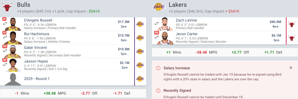 I’m pretty sure the money works on this LaVine trade, but you’d have to wait until January 15th in order for Rui Hachimura to become trade eligible. Most Bulls fans would want Austin Reaves to come back in this trade, and if you can get him that would be great, but I’ve always like Jaxson Hayes and I’m the dope writing this post, so there. Any trade of LaVine to the Lakers is going to feature D’Angelo Russell and Rui Hachimura in Bulls uniforms, that’s the only way for the money to work, the other players and/or picks attached are mostly filler.